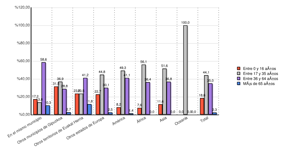 | Continente | Entre 0 y 16 años | Entre 17 y 35 años | Entre 36 y 64 años | Más de 65 años | Total | |||||