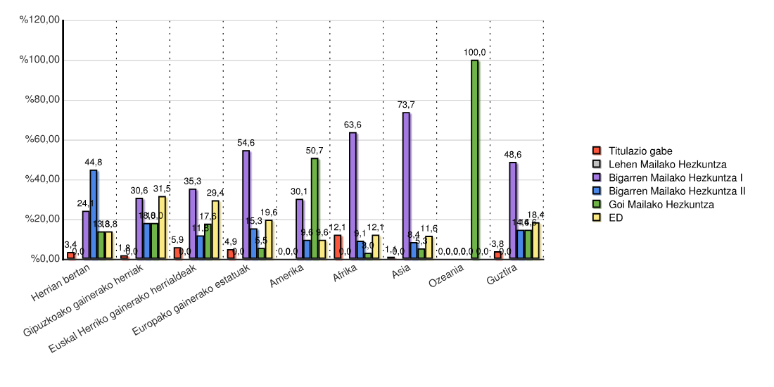 | Kontinentea | Titulazio gabe | Lehen Mailako Hezkuntza | Bigarren Mailako Hezkuntza I | Bigarren Mailako Hezkuntza II | Goi Mailako Hezkuntza | ED | Guztira | |||||||