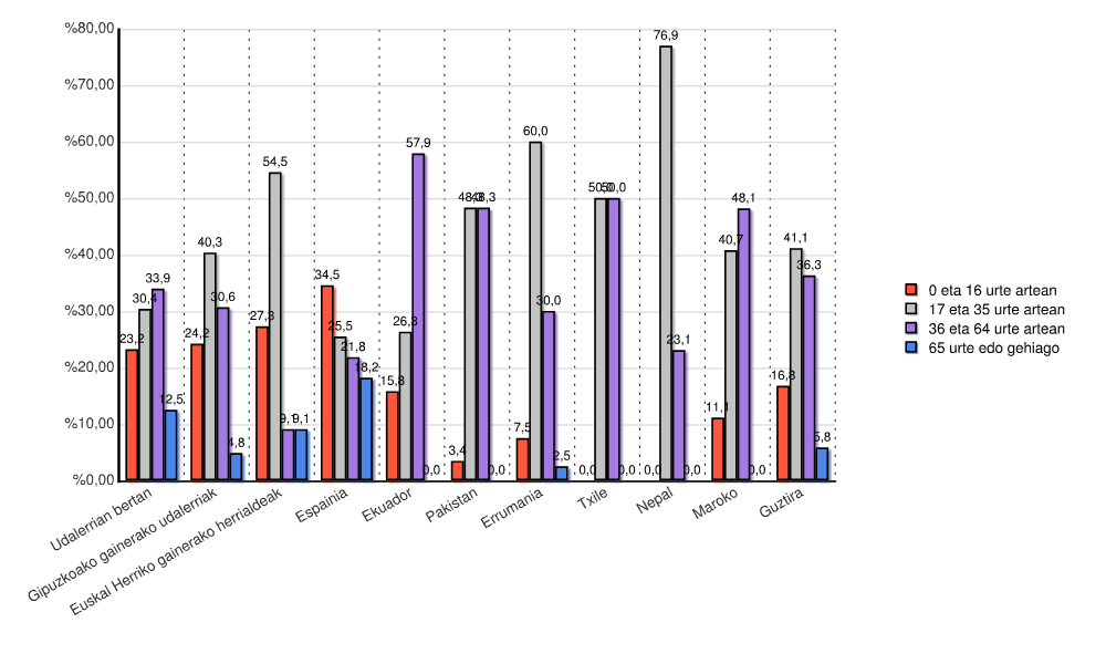 | Estatua | 0 eta 16 urte artean | 17 eta 35 urte artean | 36 eta 64 urte artean | 65 urte edo gehiago | Guztira | |||||