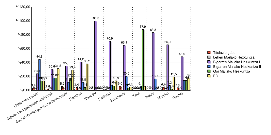 | Estatua | Titulazio gabe | Lehen Mailako Hezkuntza | Bigarren Mailako Hezkuntza I | Bigarren Mailako Hezkuntza II | Goi Mailako Hezkuntza | ED | Guztira | |||||||