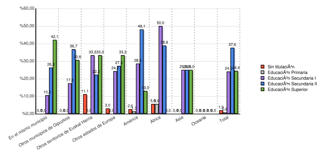 | Continente | Sin titulación | Educación Primaria | Educación Secundaria I | Educación Secundaria II | Educación Superior | Menores de 16 años | Total | |||||||