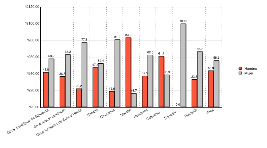 | Otros municipios de Gipuzkoa | 41 | 41,8 | 57 | 58,2 | 98 | 100,0 |