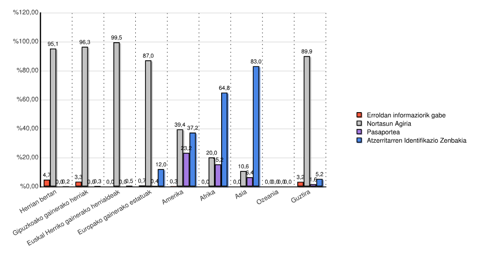 | Kontinentea | Erroldan informaziorik gabe | Nortasun Agiria | Pasaportea | Atzerritarren Identifikazio Zenbakia | Guztira | |||||