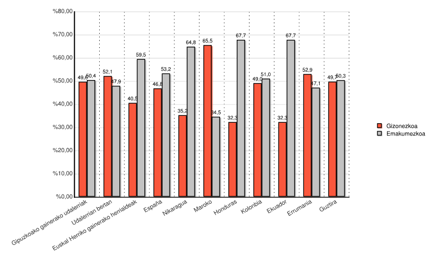| Gipuzkoako gainerako udalerriak | 1.264 | 49,6 | 1.282 | 50,4 | 2.546 | 100,0 |