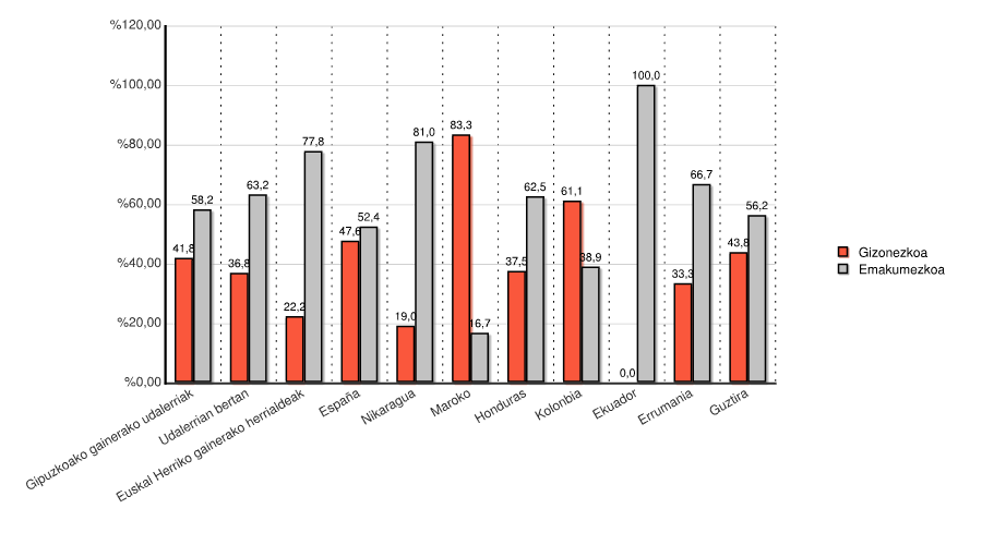 | Euskal Herriko gainerako herrialdeak | 0 | 0,0 | 5 | 55,6 | 4 | 44,4 | 0 | 0,0 | 9 | 100,0 |