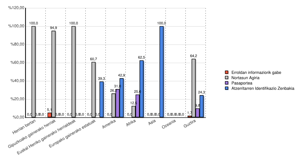 | Kontinentea | Erroldan informaziorik gabe | Nortasun Agiria | Pasaportea | Atzerritarren Identifikazio Zenbakia | Guztira | |||||