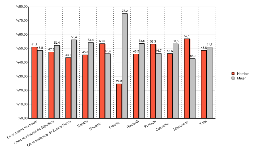 | Otros municipios de Gipuzkoa | 3.667 | 47,6 | 4.040 | 52,4 | 7.707 | 100,0 |