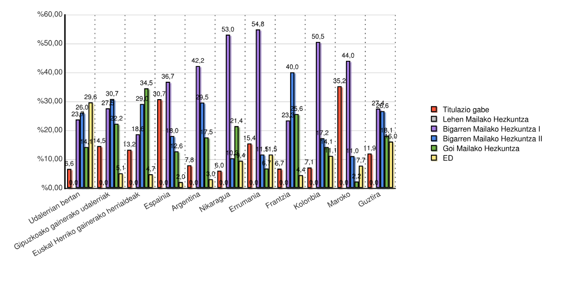 | Estatua | Titulazio gabe | Lehen Mailako Hezkuntza | Bigarren Mailako Hezkuntza I | Bigarren Mailako Hezkuntza II | Goi Mailako Hezkuntza | ED | Guztira | |||||||