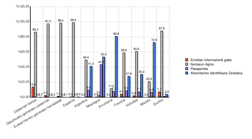 | Estatua | Erroldan informaziorik gabe | Nortasun Agiria | Pasaportea | Atzerritarren Identifikazio Zenbakia | Guztira | |||||