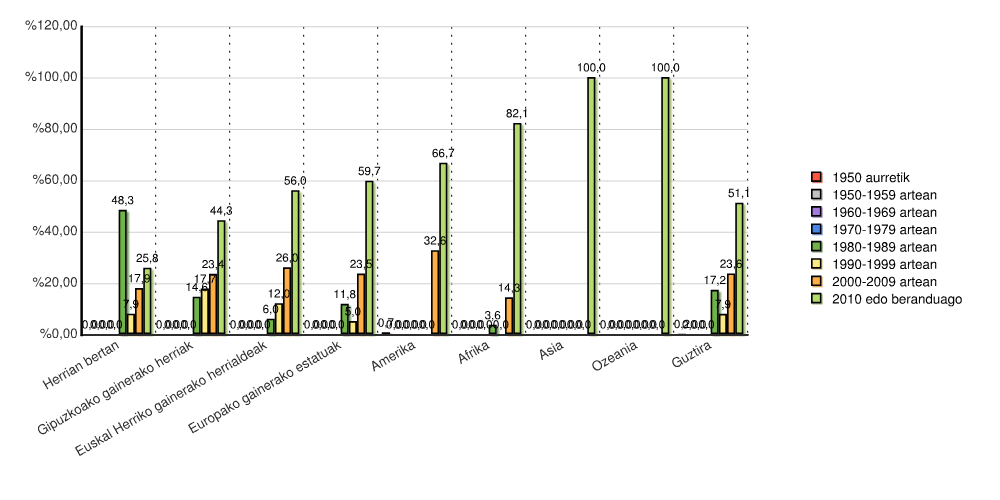 | Euskal Herriko gainerako herrialdeak | 0 | 0,0 | - | - | - | - | - | - | 3 | 6,0 | 6 | 12,0 | 13 | 26,0 | 28 | 56,0 | 50 | 100,0 |