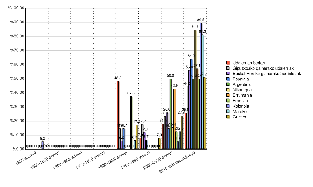 | Euskal Herriko gainerako herrialdeak | 0 | 0,0 | 0 | 0,0 | 0 | 0,0 | 0 | 0,0 | 3 | 6,0 | 6 | 12,0 | 13 | 26,0 | 28 | 56,0 | 50 | 100,0 |