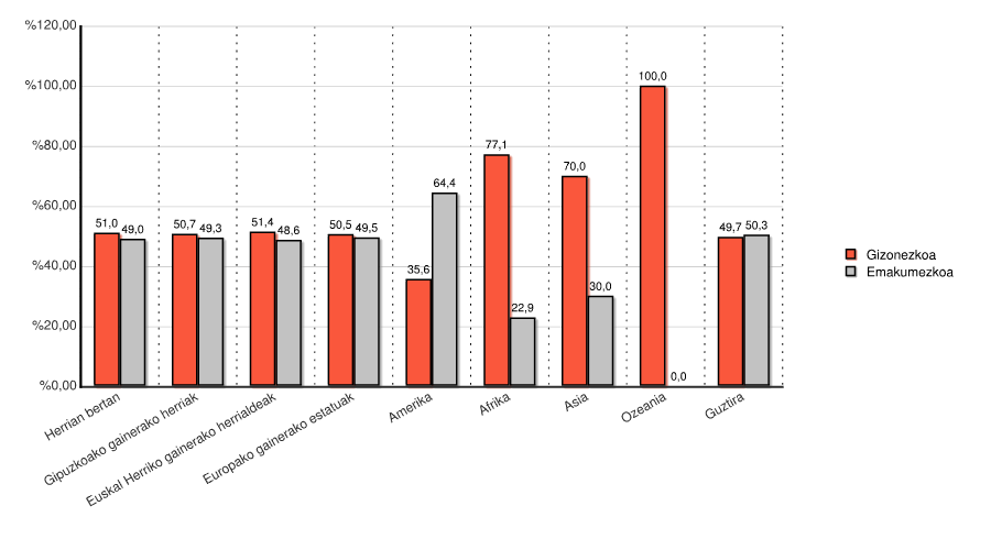 | Euskal Herriko gainerako herrialdeak | 38 | 51,4 | 36 | 48,6 | 74 | 100,0 |