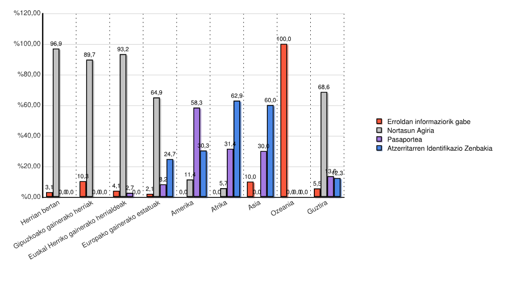 | Kontinentea | Erroldan informaziorik gabe | Nortasun Agiria | Pasaportea | Atzerritarren Identifikazio Zenbakia | Guztira | |||||