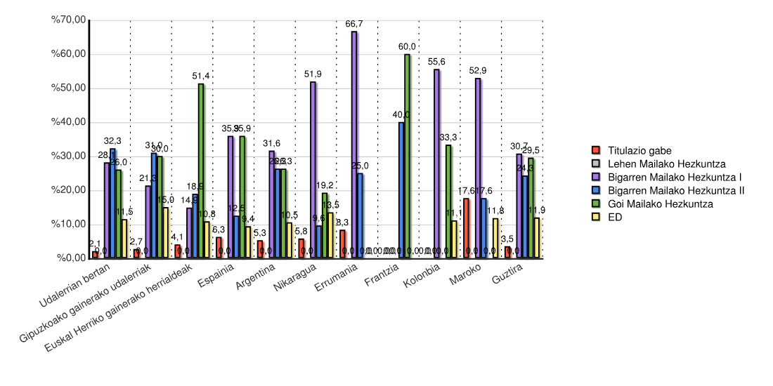 | Estatua | Titulazio gabe | Lehen Mailako Hezkuntza | Bigarren Mailako Hezkuntza I | Bigarren Mailako Hezkuntza II | Goi Mailako Hezkuntza | ED | Guztira | |||||||
