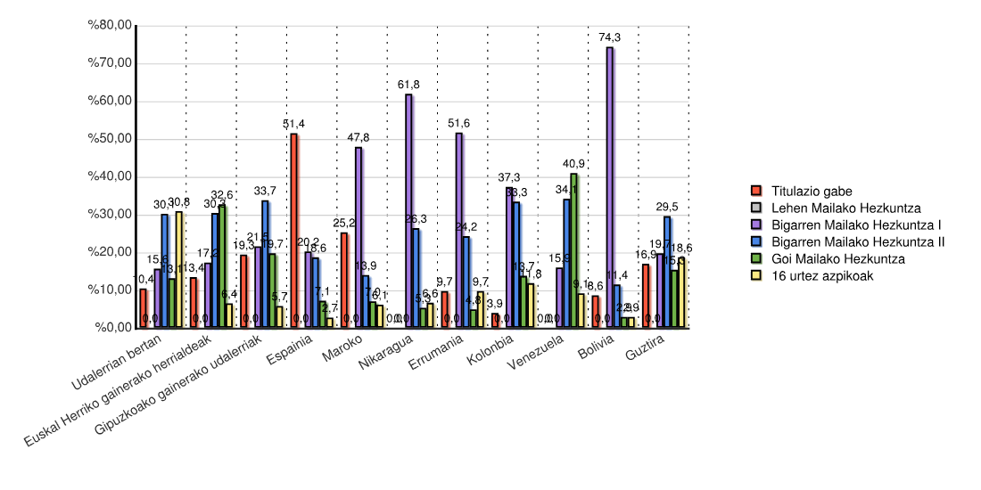 | Estatua | Titulazio gabe | Lehen Mailako Hezkuntza | Bigarren Mailako Hezkuntza I | Bigarren Mailako Hezkuntza II | Goi Mailako Hezkuntza | 16 urtez azpikoak | Guztira | |||||||